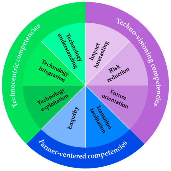 A final set belonging to this category is “technology exploitation” competencies. It concerns advisors’ capability to uncover and realize the value proposition of technologies [53], and help farmers deal with the complexity of digital tools, translate the data offered by decision support systems and other applications into valuable insights, and derive benefits from them, which, as research indicates [46,50,54], is a challenge for adopters.