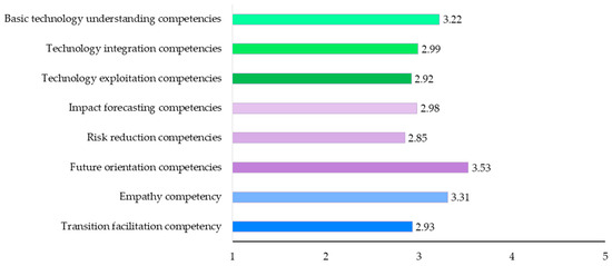 The mean scores of the variables related to the eight competency sets (Figure 2) indicate that students have low to moderate levels of technocentric competency. The highest mean score was observed in technology understanding competencies (M = 3.22, S.D. = 1.05), while more challenging types of competencies received mean scores below 3.00. The observed differences among technology understanding competencies, technology integration (t = 3.18, p = 0.002), and exploitation competencies (t = 4.61, p < 0.001) were significant.