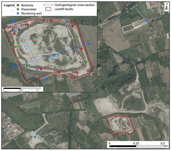 S.A.P.NA. S.p.A. is a public company owned by local authorities, and it currently manages the Settecainati-Cava Bianco Landfill. The landfill facility is located in an almost plain area, sloping towards the west, and characterised by the presence of agricultural fields, orchards and scattered buildings. Pit quarries, for the extraction of pozzolan soil [], are present on the northern and western sides of the landfill. The landfill itself occupies the area of a previous pit quarry (for the extraction of pozzolan soil). The landfill was active for about one year (2004–2005), and it was closed immediately after. A total of about 617,000 tons of municipal solid waste (MSW) were stored in the landfill during its active phase. According to 2014/955/EU [], the wastes were classified as ‘E.E.R. 19.05.03’ (off-specification compost) and ‘E.E.R. 19.12.12’ (other wastes, including mixtures of materials, from the mechanical treatment of wastes not containing hazardous substances, i.e., not containing explosives, flammable gases/aerosols/liquids/solids, self-reactive or self-heating substances, substances corrosive to metal or substances hazardous to the ozone layer). Geological, geognostic and geophysical surveys conducted in the landfill area in the 2010s were used for the geological and hydrogeological reconstruction of the area and the landfill body. Sixteen borehole logs (to depths of 50–55 m) were used for the litho-stratigraphic reconstruction, and the results of permeability tests (Lefranc and slug tests) were used for the hydrogeological parametrisation of lithological materials (i.e., pyroclastic deposits); six geoelectric tomographic profiles were used for the delineation of the landfill body. Piezometers were installed in five out of the sixteen boreholes, to depths of 90 m, to measure groundwater levels and to enable the collection of groundwater samples for chemical analyses (Figure 3).