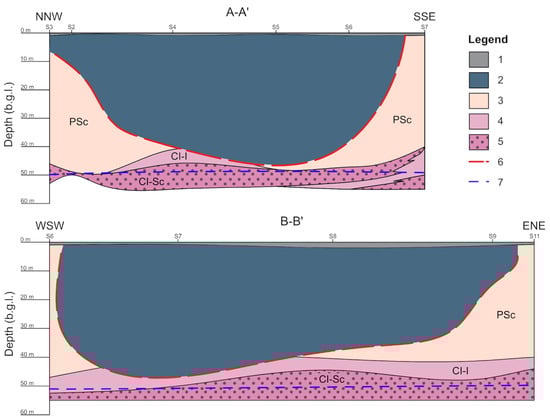 NW–SE and SW–NE litho-stratigraphic cross-sections. Traces are taken from Figure 3. Legend: (1) made ground; (2) landfill material; (3) upper pyroclastic deposits (PSc); (4) Campanian Ignimbrite, incoherent facies (CI-I); (5) Campanian Ignimbrite, scoriaceous facies (CI-Sc); (6) bottom of the landfill body reconstructed from geoelectric tomographic profiles; (7) piezometric level (October 2022).