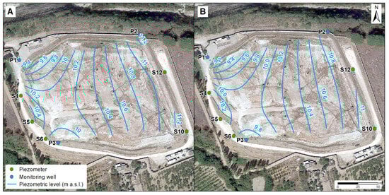 Piezometric level of the shallow, unconfined aquifer in June (A) and October (B) 2022. Basemap: Orthophoto of the landfill area in 2021, provided by S.A.P.NA. S.p.A.