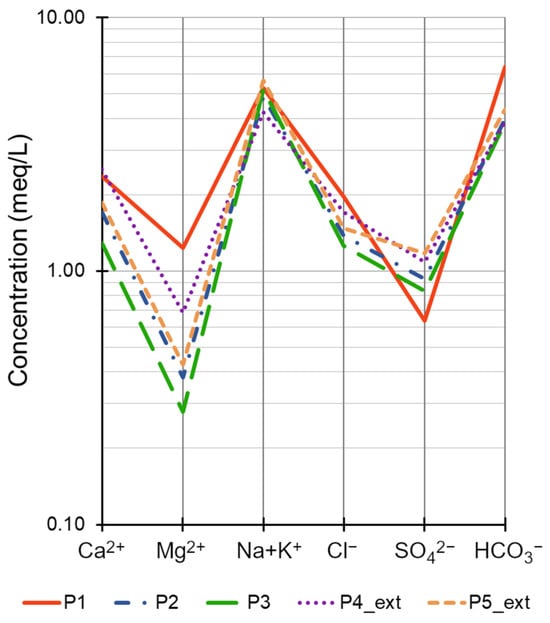 Schoeller–Berkaloff diagram of water samples located in Figure 3 collected in June–July 2022.