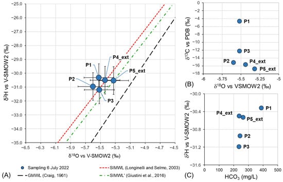 (A) δ18O–δ2H diagram for the selected monitoring points with the global meteoric water line (GMWL, []) and two local meteoric water lines valid for Southern Italy: LMWL [] and LMWL’ []. (B) δ18O–δ13C diagram. (C) HCO3−–δ2H diagram.