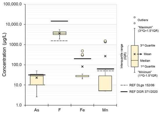 Boxplot representation of As, F, Fe, Mn concentrations in water samples located in Figure 3 and collected in the period June–December 2022 (total number of samples = 17). For the purpose of this representation, below-detection limit values were set equal to the limit value. Each boxplot is compared with the corresponding regulatory reference values (REF) at the Italian level (Legislative Decree 152/06 []) and Campanian regional level (Regional Decree 371/2020 []) for the Phlegrean Fields GWB.