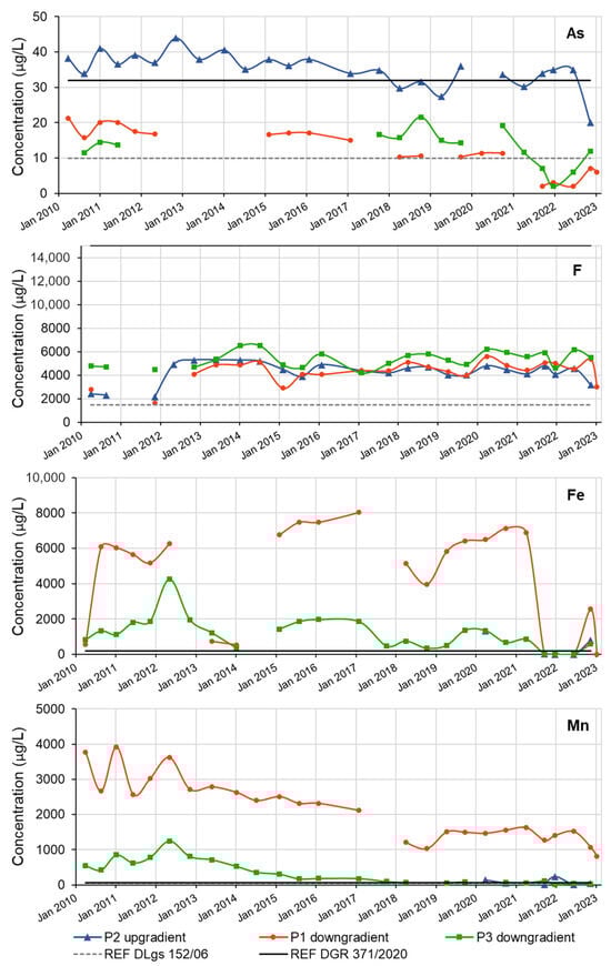 Concentrations of As, F, Fe, Mn in the monitoring wells located within the landfill facility from 2010 to 2023. Each plot is compared with the corresponding regulatory reference values (REF) at the Italian level (Legislative Decree 152/06 []) and Campanian regional level (Regional Decree 371/2020 []) for the Phlegrean Fields GWB.
