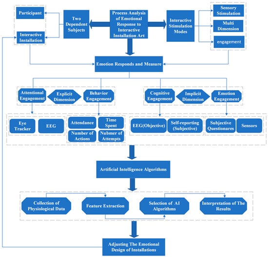 This research aims to investigate the emotional responses evoked during interactive installation art. It focuses on capturing explicit and implicit data between participants and the artwork, utilizing artificial intelligence algorithms for emotional measurement. We propose a theoretical framework to analyze the emotional response process in interactive installation art, as shown in Figure 1. The framework considers measuring the emotional responses experienced by participants across different stimulation modes offered by the installation art. This process involves a complex interplay between attention, behavior, cognition, and emotion [92]. While attention and behavior are considered explicit data, cognition and emotion are categorized as implicit data. In interactive interactions, emotional responses can only be fully understood by considering the combination of explicit and implicit data. Each dimension of attention, behavior, cognition, and emotion can be measured through physiological signals, including brain activity, heart rate variability, skin conductance, facial expressions, and eye tracking. Artificial intelligence algorithms can be employed to analyze and interpret these physiological signals, providing valuable insights into participants’ emotional experiences during their interactions with the installation.