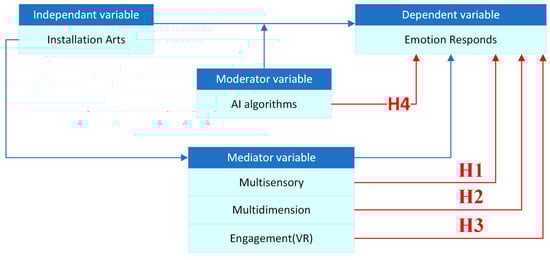Several mediator variables are considered in this study. Firstly, the sensory stimulation encompasses various sensory inputs, including visual, auditory, and tactile elements, which play a pivotal role in mediating participants’ emotional responses. Secondly, the “interaction dimensions” variable examines the influence of one-dimensional (traditional) interactions versus multi-dimensional interactions involving physical touch, movement, and gestures. These dimensions significantly shape the emotional experiences of participants. Additionally, engagement within contextual factors such as virtual reality (VR), augmented reality (AR), or mixed reality (MR) serves as another mediating factor. The depth of immersion experienced by participants within these virtual realms directly affects their emotional engagement and responses. Artificial intelligence (AI) algorithms are considered as moderator variables. These algorithms play a crucial role in determining how the AI technology operates within the interactive installation art, thus potentially influencing the overall emotional impact on participants. This research seeks to provide a comprehensive understanding of the intricate interplay between these variables, shedding light on the emotional responses within the context of AI-integrated interactive installation art.