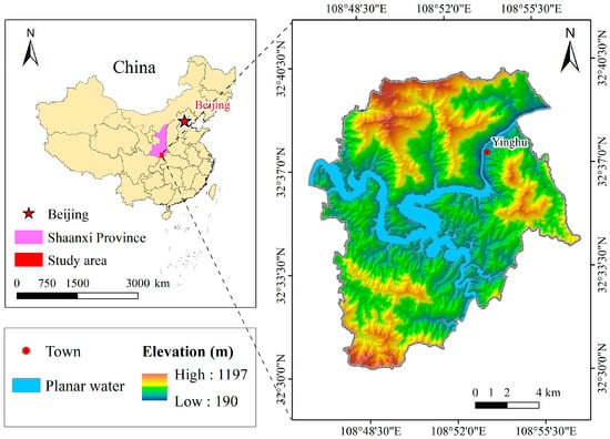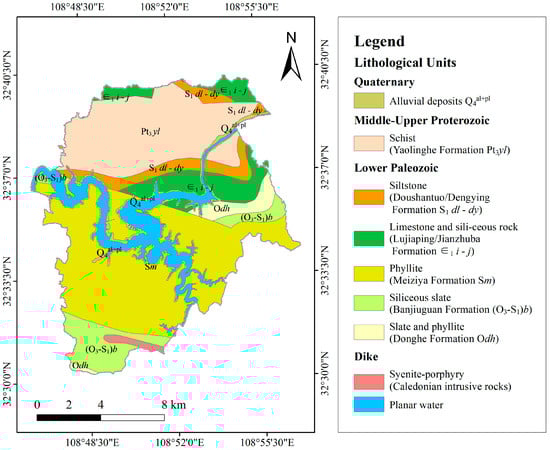 The Yinghu Lake Basin is located in the southern part of Hanbin District, Ankang City, Shaanxi Province, and has a total area of approximately 195.13 km2, with coordinates ranging from 108°46′21.89″ E–108°57′8.33″ E, 32°30′13.01″ N–32°40′16.44″ N (Figure 1). The Yinghu Lake Basin is a section of the Han River Basin, with low- and medium-relief terrain in the north and south and valley terraces and bench terraces in the middle. The study area is in the northern subtropical region and has a humid and semi-humid monsoon climate, characterized by four distinct seasons, adequate sunshine, and abundant rainfall. The average annual temperature here is 14.52 °C, and the average annual rainfall is 798.2 mm. The Quaternary, Middle-Upper Paleozoic, and Lower Paleozoic strata are exposed in the study area, mainly consisting of limestone, slate, and phyllite (Figure 2). The study area is located at the intersection of the South Qinling Indosinian Fold Belt and North Daba Mountain Caledonian Fold Belt in the Qinling Fold System and the geological structure is relatively complex, but the faults and seismic activity in the study area are quite weakly developed. The basic seismic intensity is VI and the ground motion peak acceleration is 0.05 g throughout the area, with little impact on the development of landslides.