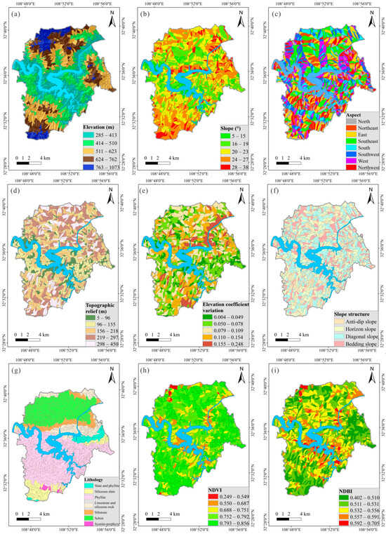 The conditioning factors affect the development of landslides; thus, the determination of reasonable conditioning factors is an important step in landslide susceptibility prediction. Generally speaking, conditioning factors can be divided into five categories: topography, geological structure, meteorology and hydrology, land cover, and human engineering activities []. Starting from the above five types of factors and based on the selection of factors [], twelve conditioning factors, including elevation, slope, aspect, topographic relief, elevation variation coefficient, slope structure, lithology, normalized difference vegetation index (NDVI), normalized difference built-up index (NDBI), distance to road, distance to river, and rainfall were selected.