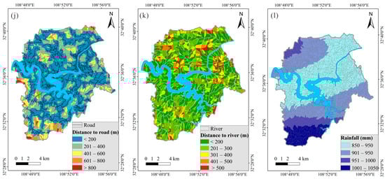 Rainfall is an inducing factor of landslide development. According to the statistics collected by the Natural Resources Bureau of Ankang City, 46 landslides in the previous landslide inventory occurred during the rainstorm period. In this paper, multi-year rainfall data from various meteorological stations in Ankang City were collected and Kriging interpolation calculations were performed in GIS to obtain rainfall contour maps (Figure 6l). The rainfall in the study area showed a trend of being high in the northern and southern parts and low in the middle part, with FR > 1 within the rainfall ranges of 851–900 and 1001–1050 mm. One possible reason for the high development of landslides in the 851–900 mm range is that this area was located on both sides of the Han River, which has a high population and strong human engineering activities.
