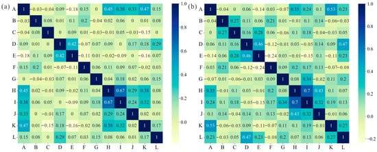 Output results of the Pearson correlation matrix: (a) updated landslide inventory; (b) previous landslide inventory (A, elevation; B, slope; C, aspect; D, topographic relief; E, elevation coefficient of variation; F, slope structure; G, strata chronology; H, NDVI; I, NDBI; J, distance to river; K, distance to road; L, rainfall).