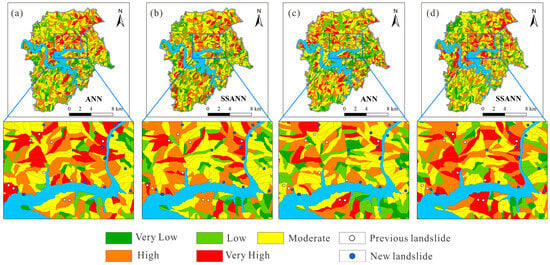 - From the perspective of the FR accuracy test (Table 3), for the updated landslide inventory, RF (0.96) > ANN (0.84) and SSRF (0.89) > SSANN (0.85); for the previous landslide inventory, RF (0.99) > ANN (0.80) and SSRF (0.98) > SSANN (0.92). It was observed that under different combination conditions, the FR accuracy of RF was greater than that of ANN, thus confirming that the RF zoning effect was more reasonable than ANN.