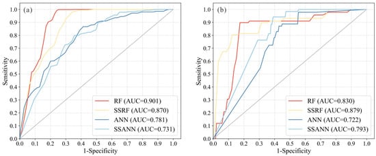 - From the perspective of the accuracy evaluation of the ROC curve (Figure 10), for the updated landslide inventory, RF (0.901) > ANN (0.781) and SSRF (0.870) > SSANN (0.731); for the previous landslide inventory, RF (0.830) > ANN (0.722) and SSRF (0.879) > SSANN (0.793). It was observed that under different combination conditions, the AUC value of RF was greater than that of ANN, thus confirming that RF had lower uncertainty, higher model robustness, and higher prediction accuracy than ANN.