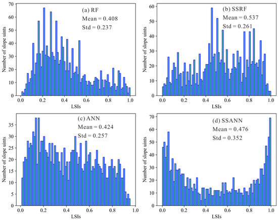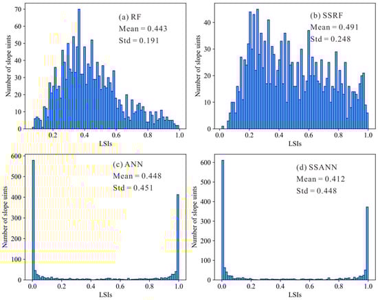 The distribution pattern of the landslide susceptibility index (LSI) is a model evaluation method that has been proposed in recent years [], and it reflects the model’s control over the overall landslide susceptibility trend in the study area. In general, a reasonable evaluation result should have the characteristics of small mean and large standard deviation in its LSI. The lower the mean of the LSI, the smaller the overall landslide susceptibility trend in the region. Meanwhile, the higher the standard deviation, the greater the difference between LSIs and the better the susceptibility zoning effect.