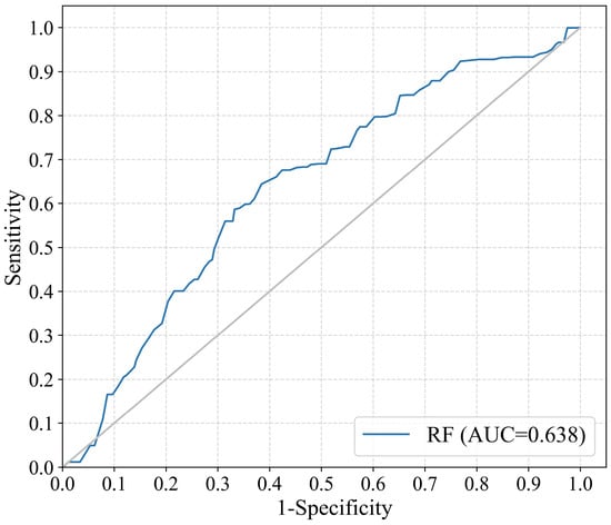 The area under the ROC curve (AUC) can be used to describe the prediction performance of the model, with values ranging from 0.5 to 1.0. The larger the value, the better the prediction performance. Generally speaking, 0.5–0.7 represents a poor predictive ability of the model, 0.7–0.9 represents a high prediction performance of the model, and 0.9–1.0 represents an excellent prediction performance [].