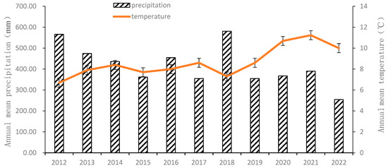 The water samples had a pH of 7.66 with a total salt content of 296 mg/L. The soil samples contained 12 g/kg soil organic matter [33], 51 mg/kg hydrolyzable nitrogen [34], 9.3 mg/kg Olsen-P [35], 480 mg/kg Olsen-K [36], and 1.19 g/kg total water-soluble salts [37], and had a pH of 7.97 [38]. The annual mean precipitation is 417.77 mm, and the annual mean temperature is 8.65 °C [39]. Details are shown in Figure 2.