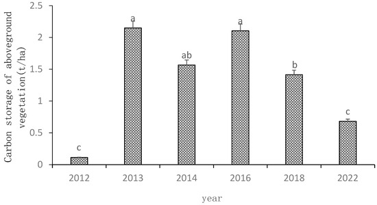 The aboveground vegetation carbon stock first increased, and then, decreased with the duration of ecological restoration; we recorded a minimum of 0.11 t/ha in 2012 and a peak of 2.15 t/ha in 2013 (Figure 1). The results of LSD multiple variance comparisons showed a significant difference between the aboveground vegetation carbon stock in 2012 and 2013 (p < 0.01). The difference was not significant between 2013 and 2018, but a significant difference was found between 2018 and 2022 (p < 0.01). Details are shown in Figure 4.