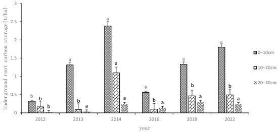 Underground root carbon storage from 2012 to 2022. Note: Different lowercase letters (a and b) indicate significant differences in different years at the 0.05 level.