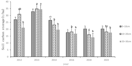Carbon storage in the 0–30 cm soil layer from 2012 to 2022. Note: Different lowercase letters (a, b, and c) indicate significant differences in different years at the 0.05 level.