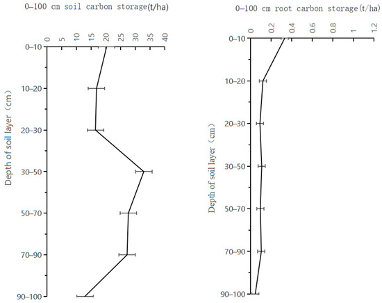 The underground root biomass in the 0–100 cm layer decreased with the increase in soil depth. The maximum carbon stock was 0.33 t/ha in the 0–10 cm soil layer, and the carbon stock of the underground root system in the 0–10 cm layer was significantly different (p < 0.05) from that recorded in the other soil layers. The underground root carbon stock in the top 0–30 cm of soil was 0.55 t/ha, accounting for 60.33% of the root carbon stock in the 0–100 cm soil layer [44].