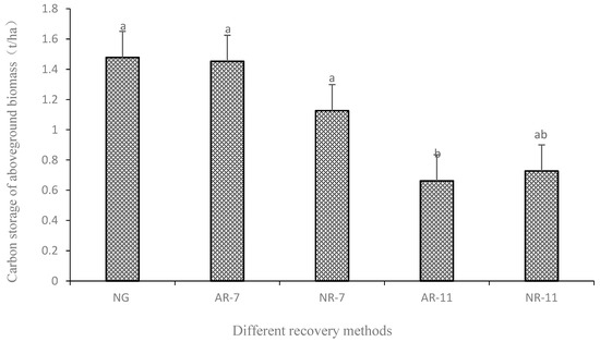 Carbon storage in aboveground vegetation in different restoration years. Note: NG—native grassland; AR-7—artificial recovery for 7 years; NR-7—natural recovery for 7 years; AR-11—artificial recovery for 11 years; NR-11—Natural recovery for 11 years. Different lowercase letters (a and b) indicate significant differences in different years at the 0.05 level.