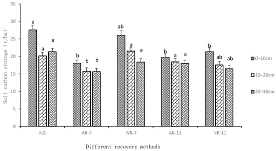 Carbon storage in soil in different restoration years. Note: NG—native grassland; AR-7—artificial recovery for 7 years; NR-7—natural recovery for 7 years; AR-11—artificial recovery for 11 years; NR-11—natural recovery for 11 years. Different lowercase letters (a and b) indicate significant differences in different years at the 0.05 level.