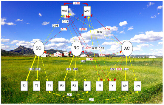 Structural equation modeling [39]. Chisq = 76.879, p = 0.000, gfi = 0.851, cfi = 0.945, rmr = 0.089, srmr = 0.090, rmsea = 0.115. Note: MAT—annual mean temperature; MAP—annual mean precipitation; SC—soil carbon stock; RC—underground root carbon stock; AC—aboveground vegetation carbon; SW—Shannon–Wiener’s index; SP—Simpson’s index; N—number of individuals; Y—aboveground vegetation carbon stock; R1—0–10 cm underground root carbon stock; R2—10–20 cm underground root carbon stock; R3—20–30 cm underground root carbon stock; T1—0–10 cm soil carbon stock; T2—10–20 cm soil carbon stock; T3—20–30 cm soil carbon stock; C1—0–10 cm soil layer carbon content; C2—10–20 cm soil carbon content; C3—20–30 cm soil carbon content; Solid yellow lines and solid red lines indicate the significant positive and negative effects, respectively. Dotted yellow lines indicate the nonsignificant effects.