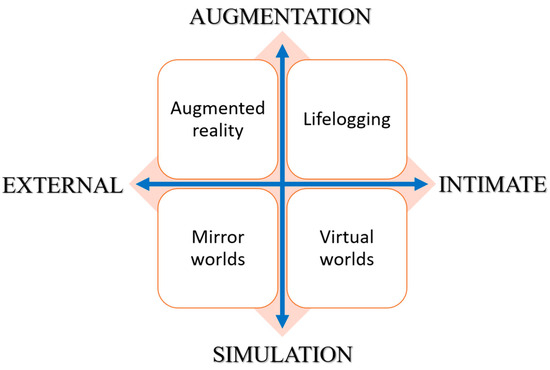 The post-COVID era has been accompanied by increased interest from universities in the metaverse. Increased investment in platform and technology development as well as new features and new applications have characterized this era. Kye et al. [20] propose two technological axes associated with the metaverse, as seen in Figure 1. The first of these axes, “Augmentation versus Simulation”, refers to augmentation technology and how it adds a new visual function to the existing environment by superimposing digital information on the physical world that we perceive with our senses. On the other hand, simulation technology refers to generating and manipulating virtual models of the existing physical environment and creating virtual interactions and experiences.