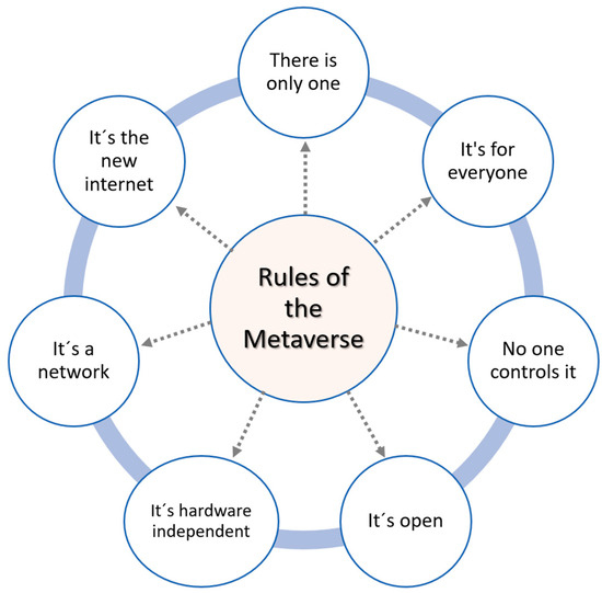 - Parisi, T. The Seven Rules of the Metaverse. Metaverses 2021. Available online: https://medium.com/meta-verses/the-seven-rules-of-the-metaverse-7d4e06fa864c (accessed on 15 January 2023).