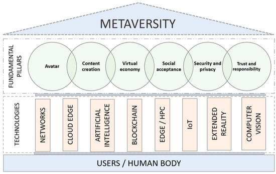 The emerging character in the application of the metaversity detected in this document opens the doors for the many questions that still do not have a firm answer. Many of the barriers that the metaversity will have to overcome are inherited from the immersive technologies themselves and the implementation of the metaverse. Issues associated with scalability, accessibility of XR devices, and the struggle between multiple metaverses are some of the more general ones. All of these coincide with the six fundamental pillars for creating the metaverse ecosystem proposed by Lee et al. [52] and in the eight technologies in which they are leveraged. All these pillars and technologies are based on and supported by the human resources that develop and use them, as shown in Figure 4 and described below.
