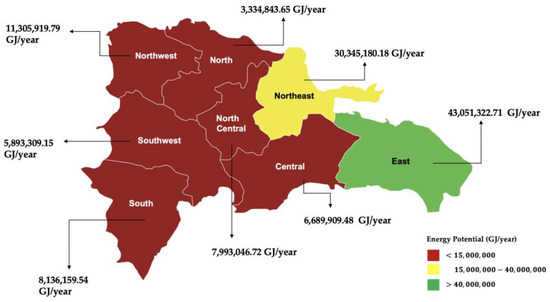 Figure 2 is a georeferenced map illustrating the geographical distribution of the energy potential of residual biomass in the Dominican Republic. This map highlights the areas with the highest concentration of resources, offering an adequate visualization of the regions with the most significant potential for using residual biomass.