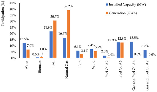 Installed capacity and power generation in the national interconnected electricity system of the Dominican Republic reached 5004.4 MW and 21,455.4 GWh, respectively, according to the publication made by the System Operator in the annual operation and market report of the year 2021 [26]. Figure 3 shows that the largest installed capacity corresponds to coal and the lowest to biomass’s primary energy source. Regarding production, natural gas outperforms coal, and biomass outperforms Fuel Oil #2. In this comparison, biomass represents 30 MW of installed capacity and 224 GWh of energy injected into the transmission grid.