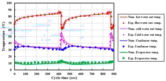 The mathematical model underwent validation using a wide range of influential components. As a sample and for demonstration purposes, computational results were juxtaposed with the experimental findings presented in Ref. [32] to validate the mathematical model for adsorption chillers. Notably, the model and experimental results exhibited a considerable degree of consistency. The comparison between the prediction values obtained by the mathematical model and the experimental data is illustrated in Figure 2.