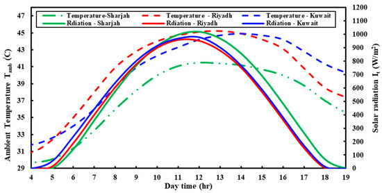 Riyadh, Saudi Arabia (24.46° N, 46.44° E), Kuwait City, Kuwait (29.22° N, 47.59° E), and Sharjah, United Arab Emirates (25.2° N, 55.24° E) are the three cities investigated in the current study during June, July, and August. The three cities’ climatic information, including the average temperature and solar radiation, was gathered from the National Solar Radiation Database (NSRDB). Figure 3 illustrates the daily It and Tamb on the day of 15 June 2019.