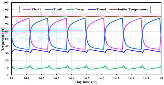 In Figure 4, the temperature profiles of the system’s condenser, evaporator, two adsorption beds, hot water storage tank, and other components are shown. The temperature profiles depicted in Figure 3 were selected between the hours of 14:00 and 15:00, which correspond to the maximal cooling capacity during the day.