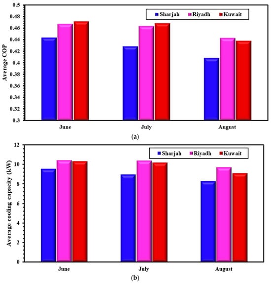 One can notice from Figure 5a,b that the best performance in terms of cooling capacity and COP is achieved in the month of June. Among the three cities tested, Kuwait City demonstrates a COP of 0.47 and a cooling capacity of 10.5 kW. Closely following this is Riyadh City, which shows a COP of 0.46 and a cooling capacity of 10.6 kW. Sharjah City demonstrates a COP value of 0.44 and a cooling capacity of 9.5 kW. This might be due to the fact that both Kuwait City and Riyadh have very similar climate conditions, specifically their high ambient temperature, as shown in Figure 3. Sharjah City was selected as a representative example to predict the performance of the adsorption cooling system throughout a typical day for each of the three tested months. The variation of the cooling capacity and COP over time is depicted in Figure 6a,b.