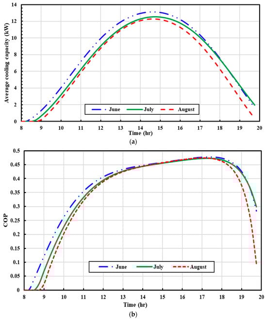 Variation of cooling capacity and COP over time for Sharjah city: (a) cooling capacity, (b) COP.