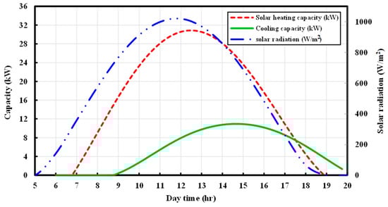 Figure 7 shows the plot of solar heating capacity and the adsorption chiller cooling capacity over time. It can be seen from Figure 7 that the solar heating capacity reaches its maximum between 12:00 and 13:00, whilst the maximum cooling capacity is achieved between 14:00 and 15:00. It is also worth mentioning that the heating capacity approaches zero at about 19:00 at sunset, while the cooling capacity persists after sunset due to the thermal inertia of the buffer tank.