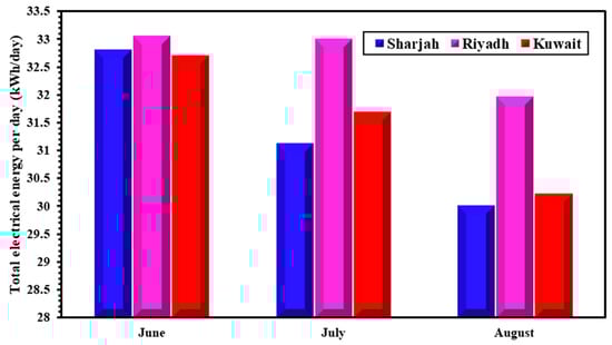 The average daily electrical energy generated throughout the three summer months in the studied cities is presented in Figure 9. As shown in Figure 9, Riyadh exhibits the highest electrical energy generation throughout all three months. Specifically, the month of June demonstrates the maximum electrical energy values generated from the PVT system in all three cities. In greater detail, in June, Riyadh achieves the highest average daily energy generation of 33.05 kWh, closely followed by Sharjah, with 32.81 kWh, and Kuwait City, with 32.69 kWh. Conversely, the month of August showcases the lowest electrical energy values for the three cities, with Riyadh averaging 31.69 kWh/day, followed by Kuwait City, with 30.21 kWh/day and Sharjah, with 30.00 kWh/day.