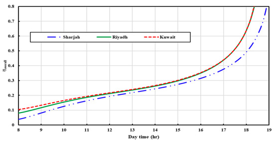Figure 10 presents the total system efficiency for all cities under investigation during a typical day in June, in which both cooling and electrical power generation are considered. As can be seen from Figure 10, for all cities under investigation, the system overall efficiency has the same trend. It increases generally with time until about 17:00. After that, one can notice that there is a sharp increase in the system’s overall efficiency, thanks to the thermal energy stored in the hot water tank that drives the adsorption cooling system during the afternoon period, when the intensity of solar radiation decreases.