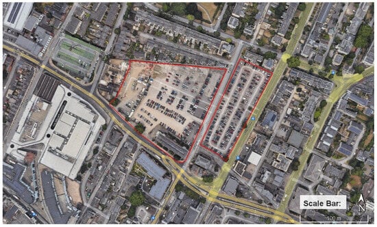 However, there are only a few studies that have examined the potential contributions of urban regeneration initiatives to climate change adaptation [], particularly those that are based on future climate change scenario forecasts and the benefits of NBS for improving thermal comfort. Moreover, given that many European cities are focusing on reducing automobile dependency as well as decreasing parking spaces to accommodate their car-free or “15-min city” policies [,], it is crucial to understand the benefits of regenerating these car parks through the application of NBS. In order to fill this knowledge gap, our study examined a specific case study in which we evaluated the advantages of two regeneration scenarios for an existing car park in Cheltenham. These scenarios involve the incorporation of 30% and 50% NBS, the use of research-through-design methodologies that include efficient climate change mitigation strategies, and the incorporation of climate change simulation data. The primary objective of our research was to assess the effects of increasing the percentage of NBS on numerous variables, such as thermal comfort, temperature, and relative humidity. These specific variables are critical in mitigating the negative effects of heatwaves caused by climate change and, as a result, in lowering the related mortality risk [,].