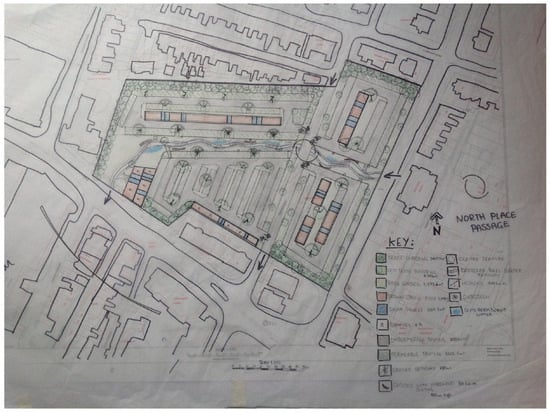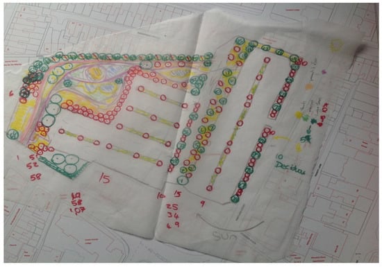 The RtD approach was chosen based on past post-positivist microclimatic urban design research because it produces accurate and trustworthy knowledge, creating evidence that supports urban microclimate-responsive design [,,]. In October 2022, a three-day design workshop took place at the University of Gloucestershire. This workshop was exclusively attended by individuals with knowledge or a background in landscape architecture or urban planning. It was jointly facilitated by academics in landscape architecture from the University of Gloucestershire and experts from relevant practices. During the workshop, participants were tasked with creating regenerative designs based on specific climate-sensitive design guidelines. These designs were intended to reflect site analysis-derived requirements, with a primary focus on incorporating NBS for the regeneration of parking spaces. In particular, the 3-day design workshop involved design iterations as an integral part of the research process, aligning with the post-positivist approach of RtD [,]. The primary goal was to generate nature-based solution concepts as design outputs that could be tested through numerical modelling []. The workshop divided participants into two groups: the first group worked on the first scenario, and the second group addressed the second scenario. The results of their efforts are presented in Figure 2 and Figure 3.