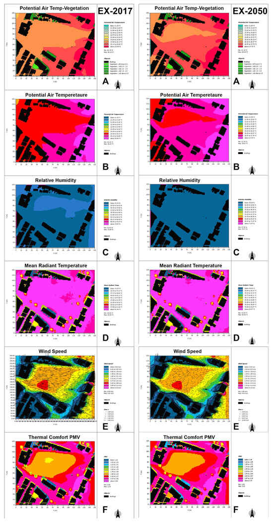 The thermal comfort value has a significant change in the centre of the site. As can be seen, the PMV value of 1.79–1.99 in (EX-2017-F) was increased from 1.99 to 2.18 in (EX-2050-F). Meanwhile, a slight change from 2017 to 2050 was illustrated in a reduction of PMV value in the centre of the site to the northwest. Generally, the PMV value in the site for 2017 and 2050 scenarios will be more than the value of 0, which identifies as a neutral-comfort predicted mean vote []. The numbers mentioned in this study are mainly average, and the predicted value of the data is demonstrated in figures.