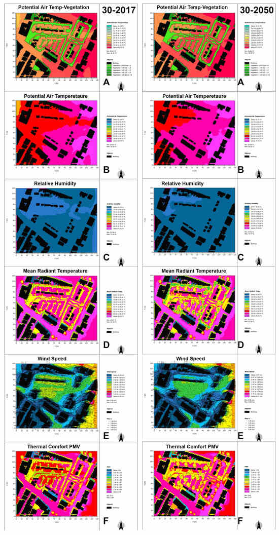 Figure 5 illustrates the scenarios for 2017 and 2050 with 30% implementation of NBS solutions as (30-2017 A to F) and (30-2050 A to F). Like the existing scenarios, maps for both scenarios of 30-2017-B and 30-2050-B demonstrate that the temperature value will be greater than 24 degrees in the 30-2017-B scenario and more than 26.20 in the 30-2050-B scenario. This highlights a 2 degree increase in certain site areas from 2017 to 2050. The affected areas are mainly about the scenario design in which the areas remain unchanged regarding the air temperature concerning dense areas of NBS interventions. The main increases in potential air temperature are from the east-side of the site to the centre and from the centre to the south-west side of the site. As shown, the areas with lower potential air temperature in 30-2017-B have decreased in the 30-2050-B scenario. Relative humidity for most of the site in the 30-2017-C scenario is below 53.40%, and it increases to a range of 53% to 55.63% in all east borders of the site, centre and north, and west-northwest of the site. In scenario 30-2050-C, relative humidity in most of the area is decreased from 50.33% to 53.15%. Still, an area covering north to west of the site demonstrates the range of 53.15% to 55.97%, consisting of trees and vegetation in the 30% NBS implementation design scenario.
