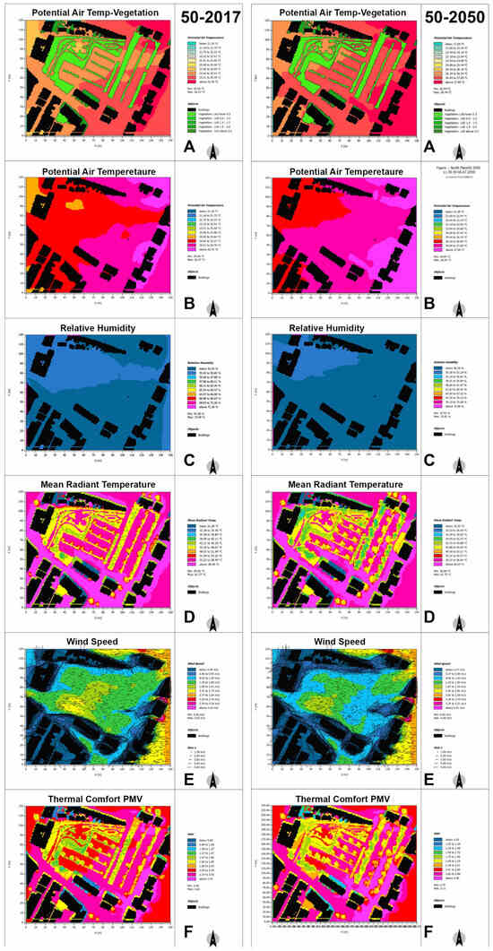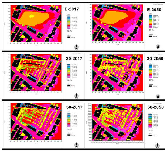 Mapped results from ENVI-met using Leonardo tool for comparison of existing scenarios 2017 and 2050. (Larger and more readable versions of these images can be found in the Supplementary Material).