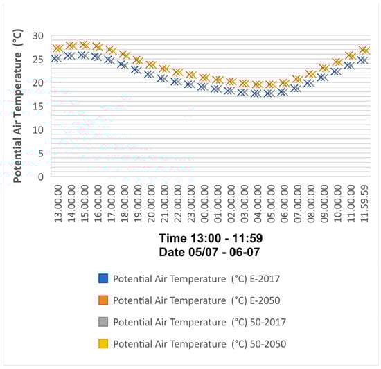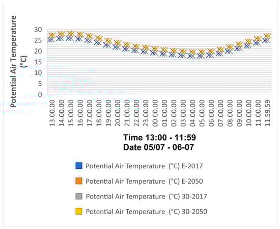 Figure 8 depicts the changes in potential air temperature for four different scenarios consisting of existing scenarios 2017 and 2050 and 30% nature-based solution implementation 2017 and 2050. The significant change in potential air temperature from the E-2017 scenario to the E-2050 scenario can be seen, and it highlights that in 24 h, the potential air temperature has a consistent increase of about 1.8 degrees. The same changes apply to the potential air temperature of scenarios 30-2017 to 30-2050. It should be mentioned that the predicted potential air temperature change from 2017 to 2050 predicted using CCweathergen in Figure 8 illustrates a more remarkable change in comparison to the simulated and mapped data using ENVI-met. While comparing EX-2017 and EX-2050 with 30-2017 and 30-2050, it can be seen that for each scenario relevant to the corresponding year, there is a slight increase of less than 1 degree from 13:00 to 15:00, followed by an insignificant decrease from 16:00 to 8:00. The potential air temperature remains nearly constant from 8:00 to 10:00, with a slight increase from 10:00 to 11:59. The numbers mentioned in this study are mainly average and the predicted value of the data is demonstrated in figures.
