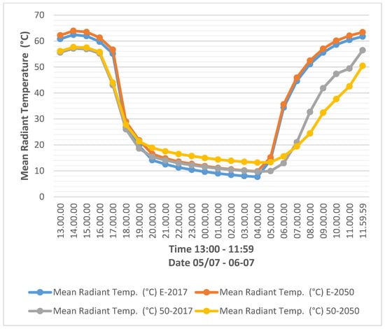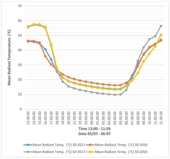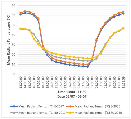 Another aspect of thermal comfort and environmental data analysis critical for understanding the benefits of urban regeneration with nature-based solutions is the mean radiant temperature which aims to calculate the transmission of radiant heat between an individual and their surroundings. A drastic decrease can be seen when comparing the existing scenarios E-2017 and E-2050 with 30% NBS implementation in 30-2017 and 30-2050 (Figure 10). This highlights a significant fall of about 15 degrees in mean radiant temperature, which could be due to the increase in the tree canopy and vegetation. The mentioned change in mean radiant temperature occurs from 6:00 to 19:00. Moreover, a decrease in mean radiant temperature with an average of 6 degrees between existing and 30% NBS scenarios adds to the significance of NBS benefits in decreasing mean radiant temperature. This decrease in mean radiant temperature highlights the benefits of this approach.