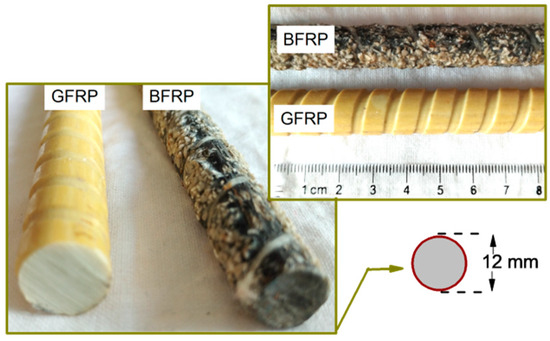 Herein, two types of reinforcements, namely BFRP rebar and GFRP reinforcements as commonly used types of FRP, with 12 mm diameter, were employed as depicted in Figure 1. The GFRP rebar features ribs on their surface, spaced at around 8.5 mm apart, with a fixed height that corresponds to 6% of the diameter of the rebar. The mechanical properties provided by the manufacturers were considered for both types of rebars, i.e., GFRP and BFRP. The GFRP rebar exhibited a reported tensile strength exceeding 1000 MPa and a modulus of elasticity of 60 GPa, whereas the sand coated BFRP rebar exhibited evident grooved helical spirals, with a spacing of 15 mm on its surface. The reported modulus of elasticity for this reinforcement was at least 60 GPa, with a minimum tensile strength of 1000 MPa.