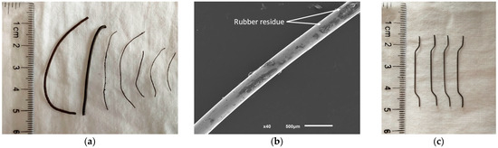 The RTSFs were sourced from a scrap tire processing plant in Portugal, and the detailed process of recycling the steel fibers can be found in the work by Soltanzadeh et al. [1]. A visual representation of the RTSFs used in the present study, showing their varying diameters, lengths, and shapes is presented in Figure 2a. The mean diameter of the fibers, dRf, was determined to be 0.38 mm with a coefficient of variation (CoV) of 40%. The RTSF (Figure 2a) exhibited a mean length, lRf, of 33 mm with a CoV of 38%. The average fibers aspect ratio (lRf/dRf) was found to be 91 with a CoV of 40% and the average tensile strength of the RTSF was 1300 MPa. The typical surface characteristics of the fibers obtained via scanning electron microscopy (SEM) photomicrograph is illustrated in Figure 2b. This figure reveals predominantly smooth fibers, although some appear twisted, deformed, or partly shredded. In certain cases, rubber residue was observed to be attached to the fibers.