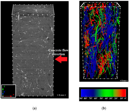 The specimen was scanned with the VivaCT 80 micro-CT system (Scanco Medical AG, Wangen-Brüttisellen, Switzerland), and the reconstructed 2D images were exported in TIF format with a pixel size of 26 µm using the manufacturer’s software. The obtained images were then used for analysis and visualization by the software from Bruker (Bruker Micro-CT, Belgium). The steel fibers were scanned using the SkyScan 1272 micro-CT system (Bruker Micro-CT, Kontich, Belgium) at a pixel size of 5 μm. Then, the reconstruction of projections, analysis, and visualization were carried out using software from Bruker to generate a high-resolution image as shown in Figure 3a. The acquired data were utilized to determine the orientation of each fiber. By analysing the cut planes, it was possible to easily determine the orientation angle of the fibers. The orientations were defined in terms of Cartesian coordinates (Figure 3a), i.e., the fibers with an orientation angle of 90° were assigned to fibers oriented perpendicular to the XZ plane, i.e., concrete flow direction, and parallel to Y direction, whereas fibers parallel to the XY plane were assigned an orientation angle of 0°. The volume rendering image of fibers deviation from the vertical axis is shown in Figure 3b. Based on this image, 13.3% of the fibers were oriented within 0–30°, 26.1% within the range 30–60°, and 60.5% within the range 60–90°. The result suggested the appropriate flowability of the concrete mix since the number of RSF and ISF oriented vertically to the concrete flow direction is about 4.5 to 6.5 times larger than the number of fibers oriented parallelly.